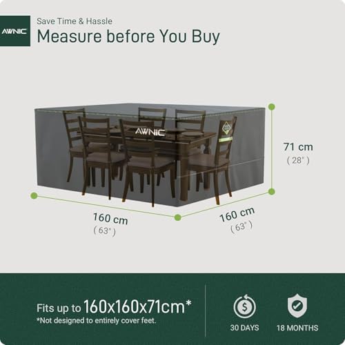 - Fits Perfectly – Say goodbye to complicated set-ups and ill-fitting covers. Every AWNIC patio furniture cover is easy to fix on your tables and irregular-sized furnishings. Our Velcro fasteners at the waist allow for a custom-like fit. Plus, its fasteners at the bottom secure the cover in place even under heavy wind conditions.