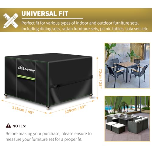 - PERFECT SIZE – The furniture cover measures approximately 49"/125 cm in length, 49"/125 cm in width, and 28"/72 cm in height. Perfect fit for various types of indoor and outdoor furniture sets, including dining sets, rattan furniture sets, picnic tables, sofa sets, coffee tables, and more. 📐 Before making your purchase, please ensure to measure your furniture set to ensure a proper fit.