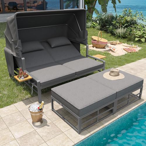 - 【Versatile Sofa & Bed in One】 This outdoor sofa effortlessly converts from a comfortable lounge sofa to a flat bed, making it perfect for reading, sunbathing, or relaxing outdoors. The adjustable backrest lets you find your ideal position, while the retractable canopy provides shade whenever you need it.