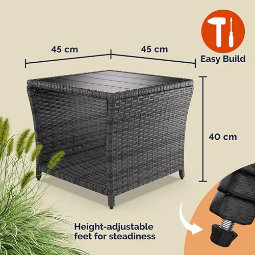 - WEATHERPROOF & ROBUST: The polyrattan is weatherproof, UV light-resistant, dirt-repellent and easy to clean. Made from a powder-coated steel frame, the 45x45x40cm garden table is extremely durable, stable and can hold up to 80kg.