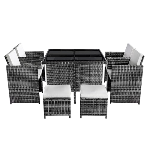 - Versatile Outdoor Dining Set: The 9 pieces rattan dining set has four armchairs, four stools, and a tempered glass top dinner table. It's a fantastic choice for enhancing your backyard, balcony, patio or deck, creating a beautiful and luxurious outdoor living space for you and your guests. The conversation set is a perfect table and chairs for outdoor gatherings.