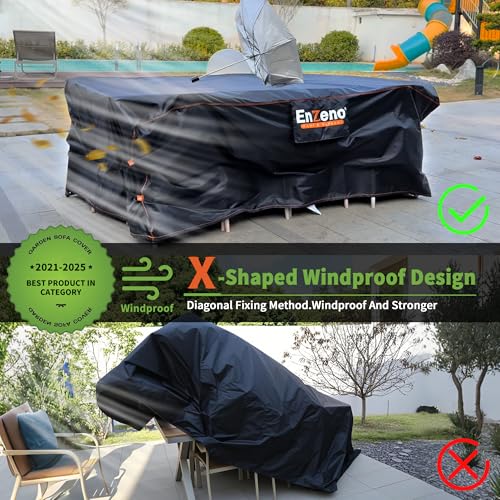- 【Upgraded X-shape windproof design】Compared to single straps. The new upgrade X-shaped straps of the Enzeno outdoor furniture cover have the effect of enhancing structural stability and improving lateral and up and down wind resistance. Together with the four Velcro straps on the bottom, the waterproof outdoor furniture cover can be securely fastened to rattan sofas, tables or chairs.