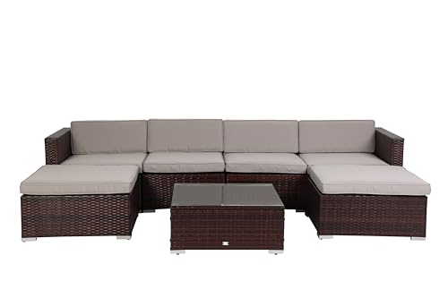 - Ample space and Super Chic: The perfect modulating set collection, entertain family or host a garden party. Indulgent, tasteful, and chic, it combines modern light grey cushions with a classic brown base for a timeless yet contemporary look. Comfortably accommodates up to 6 guests, with plenty of room to sit, snooze and snore on plush 7cm seat cushions during late summer evenings. Classic woven, PE rattan frame combined with the stylish and contemporary cushions gives you a relaxing outdoor living room feel, all you’re missing is a book and a glass of wine on your matching coffee table