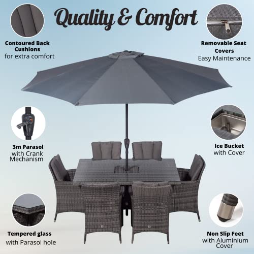 - EVERYTHING YOU NEED FOR ENTERTAINING – The 6 seater rattan dining table features a built in drinks cooler providing the perfect setting for alfresco family meals. Simply fill with ice and enjoy chilled drinks all day long, great for hosting parties and barbeques. The ice bucket drinks cooler features an integrated parasol holder to allow use of the umbrella whilst using the drinks cooler and the wind up crank mechanism makes folding the umbrella easy