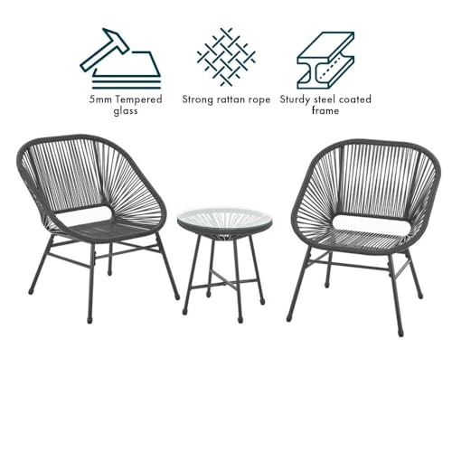 - DURABLE CONSTRUCTION: Manufactured with a durable rust-resistant, powder-coated steel frame and a 5mm tempered glass table, this bistro set is built to last for years. Whether you're curled up in the garden or conservatory you can be assured of comfort.