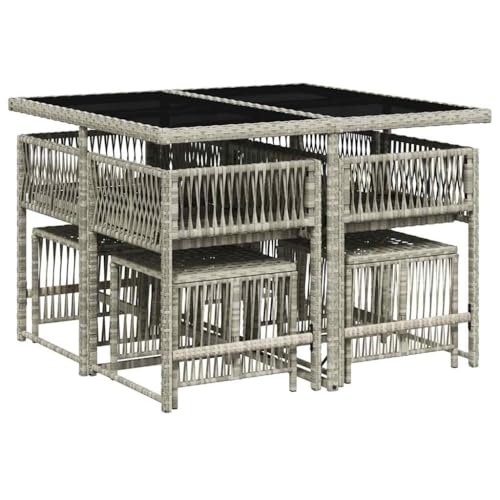 - Robust and UV-resistant PE rattan. This 9-piece dining set is made from durable, light grey PE rattan, which is UV-resistant and easy to clean. With a maximum load capacity of 110 kg per seat and dimensions of 110 x 106 x 73 cm for the table, it offers a stable solution for your outdoor area.