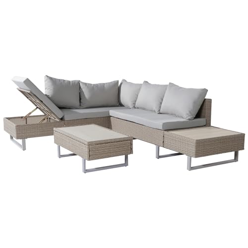 - Multifunctional design: This garden furniture is a modular movable sofa that can accommodate 4 people normally and 5 people at most. Equipped with a recliner function, it can be adjusted in five levels, up to 50°, providing a more comfortable resting experience. Side tables and lounge chairs can be replaced and installed as needed, adding flexibility and personalization.