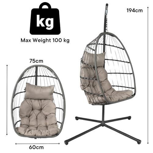 - Space saving modern designed hanging egg chair provides cosy seating even in the smallest of gardens, balconies or patio areas. Egg shape chair swing with stand is perfect in limited ground space. Maximum weight 100kg. Safety strap keeps swing chair in place.