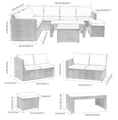 - 【DIMENSIONS】 Our 8-seater Rattan Corner Sofa Set offers generous seating space with overall dimensions of L 243.5 x W 185 x H 72cm. The included coffee table (W 100 x D 53 x H 40.2cm) is perfect for holding drinks and snacks, while the stools (W 52.5 x D 37.5 x H 41.5cm) are ideal for additional seating or lounging.
