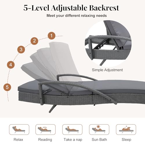 - ADJUSTABLE LOUNGER: This wicker Lounge Chair can be set at 5 different adjustable angles from 34-86 cm to suit your relaxation needs. The rattan Recliner Bed is ergonomically designed with sloping backrest to give you the best support