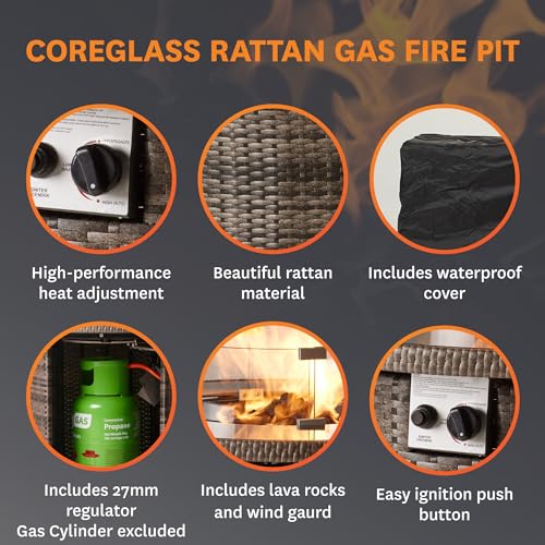 - BRINGING THE HEAT OUTDOORS – Enjoy your outdoor spaces year-round with REALGLOW Coreglass Fire Pit. With a powerful 13KW output including lava rocks to enhance the fire visual and a glass windshield to shield the flame from the wind