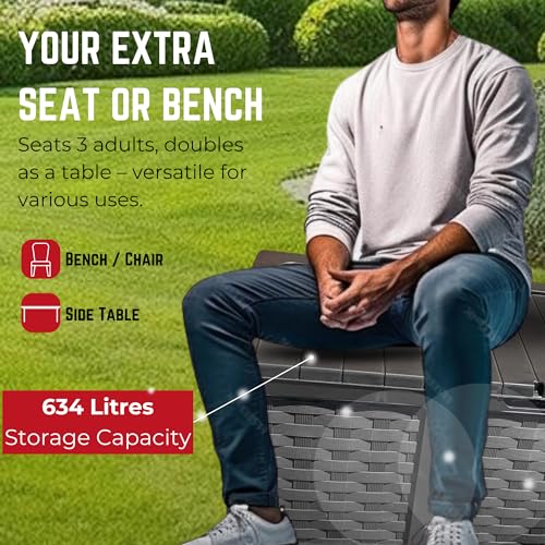 - This XXL storage box also acts as a bench, being able to seat 3 adults in your garden, wilst storing those all important garden accesories adding that little bit extra to your garden