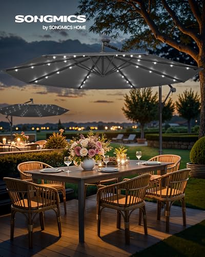![<ul><li>[Enjoy the Outdoors at Night] 32 LED lights of this solar patio umbrella can work for 6 hours after getting sufficient power from bright sunlight during the day, adding a nice, romantic ambience to your outdoor oasis at night</li><li>[All-Round, Lasting Protection] This 3 m diameter cantilever parasol with 6 ribs provides a great amount of shade. Its UPF 50+ canopy made of 180 g/m² polyester shades you from 98% of UV rays, protects you from light rain, and doesn’t get faded easily</li><li>[Reinforced Joints, for Long-Term Use] The 2 joints between the pole and the arm—essential load-bearing parts—are metal-coated to make them with more resistance to high temperatures and wind, ensuring a long service life</li><li>[Easy to Open and Adjust] Just turn the crank handle to open and close the parasol umbrella with ease and move the locking mechanism on the pole up and down to adjust the tilting angle of the canopy based on the time of the day. It’s effortless!</li><li>[What You Get] A garden parasol with a strong metal pole and cross-shaped base whose surface is covered with a durable, rust-resistant coating. Add weights of 80 kg (not included) or more above the base to ensure its functionality</li></ul> blank - Rattan Garden Furniture | Patio Furniture |Conservatory Furniture](https://www.rattangardenfurnituresets.com/wp-content/themes/mediacenter/assets/images/blank.gif)