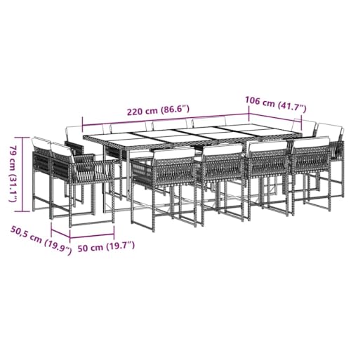 - Generous 13-piece set for 12 people. This garden dining set offers plenty of space for social outdoor activities with 12 chairs and a large table (220 x 106 x 73 cm). The maximum load capacity per seat is 110 kg, ideal for your family and guests.