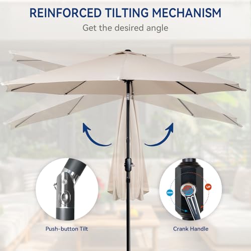 - EASY TO USE AND STORE: This parasol has a crank system that allows you to easily open and close the umbrella. The push-button angle tilt lets you angle and adjusts the canopy for optimum sun protection. It can be easy to store away. It is even easy to use for the elderly.